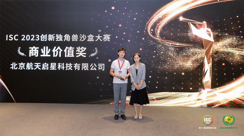 ISC 2023第十一届互联网安全大会的第一天,创新独角兽沙盒大赛迎来了终极对决。十余位业内专家出席决赛现场,评审专家由客户代表、行业专家、咨询专家、媒体大咖组成。专家们从技术创新能力、商业变现能力、行业推动价值、团队作战能力等多元视角审视参赛十强。经过激烈角逐,航天启星以商业价值最高分荣获本次大赛“商业价值奖”,入驻360未来数字安全名人堂!