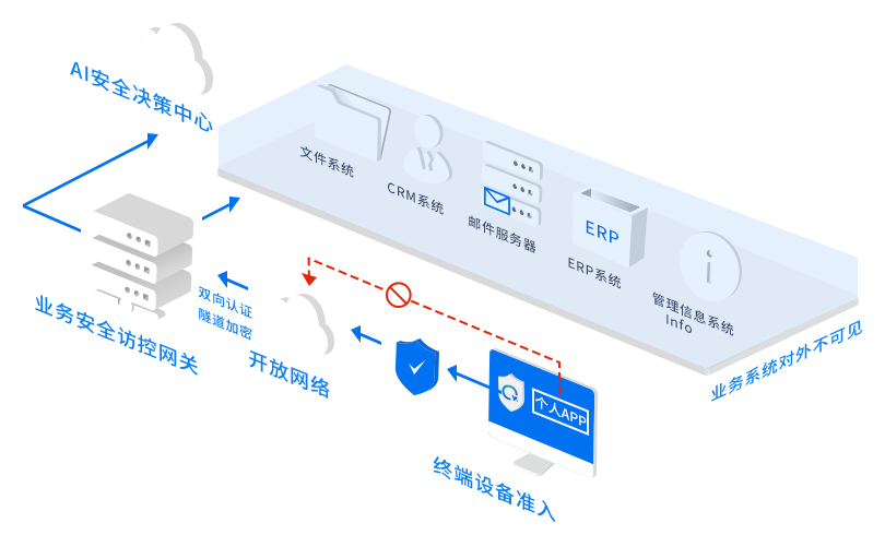 由于担心数据泄露及网络入侵的问题,企业面向互联网只能使用VPN技术开放有限的应用,并且业务落地后面临巨大的终端安全风险。航天启星助力全面拥抱零信任网络访问,企业可实现内外网一致的安全管控和体验,提升生产力。
